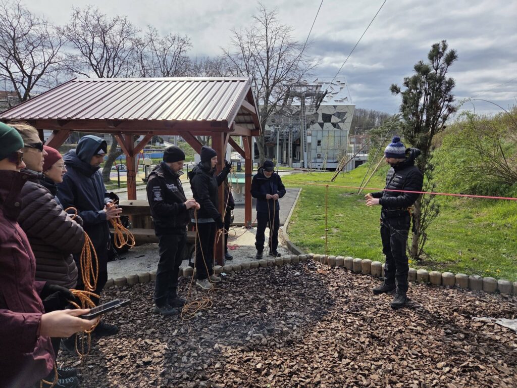 Kada sam “došla k sebi”, vratila sam se i dočekala me izvedba takozvanog Prusikovog cvora koji sluzi za fiksiranje zamke na uze većeg promjera. Njime pričvršćenu zamku koristimo za samoosiguranje pri spustanju ili penjanju po užetu. Pokušala sam pohvatati i ostale čvorove koje smo vježbali (ambulantni, bulin…), ali shvacam da ce mi puno vremena trebati da ih izvježbam.