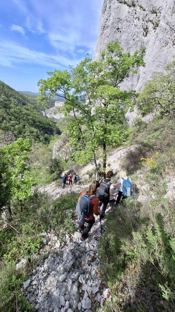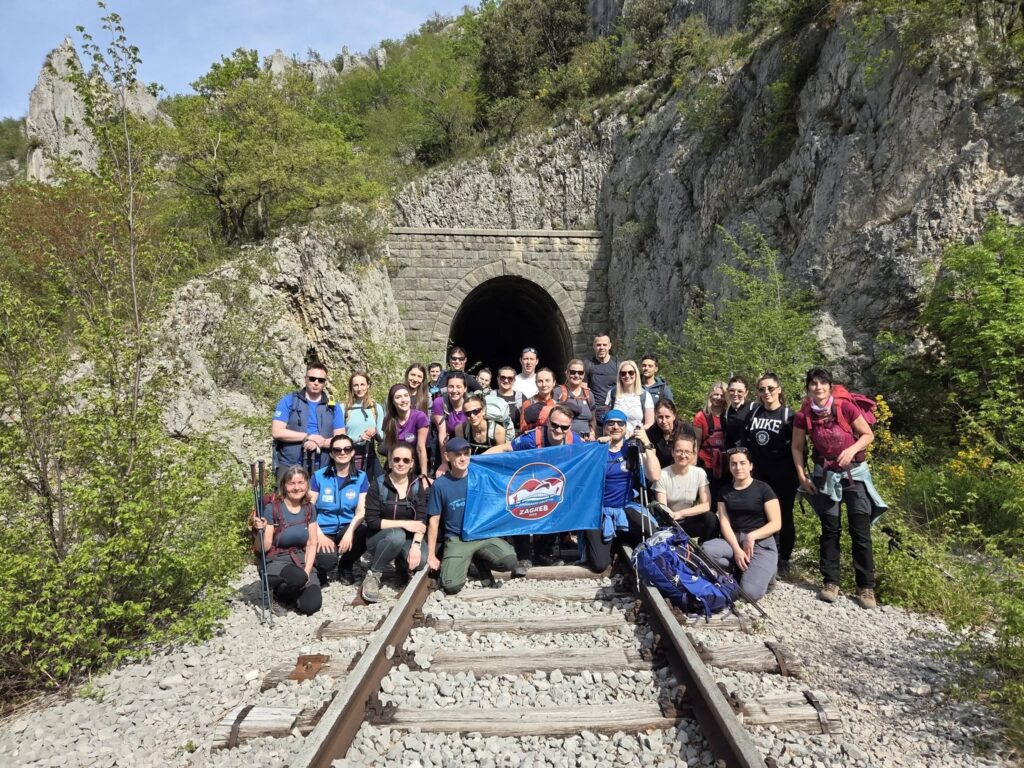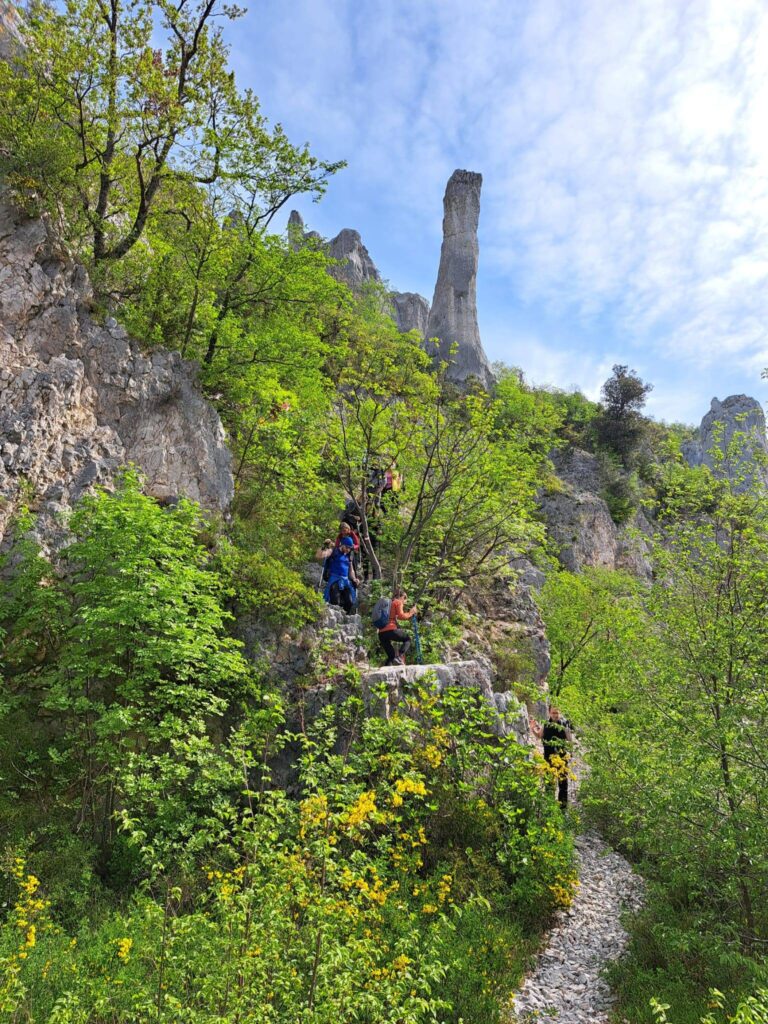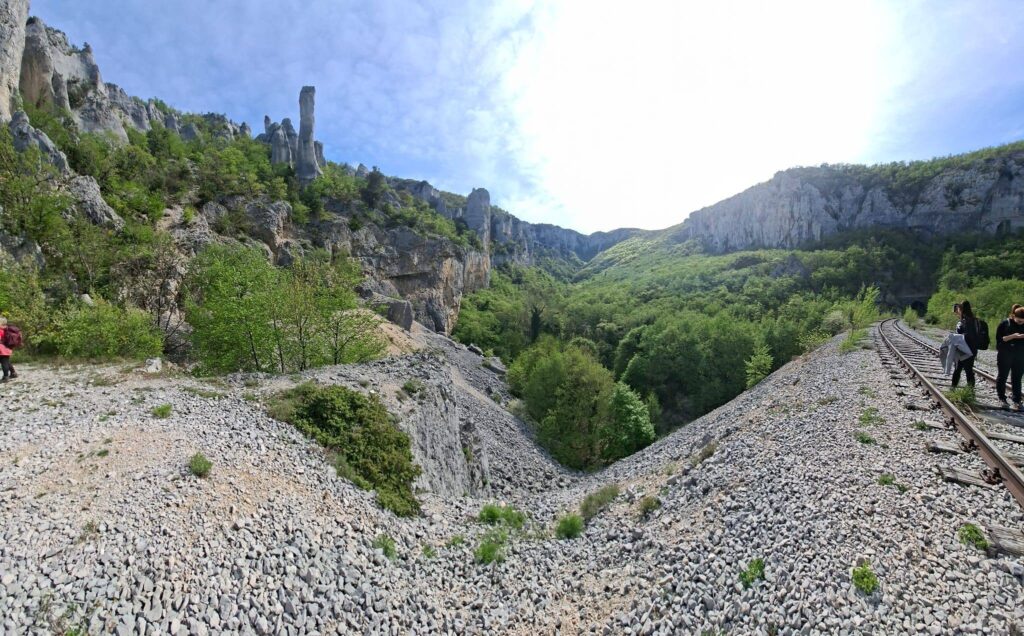 Od vidikovca do podnožja kanjona, trebalo nam je oko 40-ak minuta spuštanja krševitom stazom, po kojoj je na nekim dionicama trebalo primijeniti i pravilo “3 sigurne točke“, no uz pomoć naših vodiča Gorana, Petre i Mislava, svi školarci i članovi uspješno su to savladali bez većih poteškoća. U samom podnožju nas je dočekao još jedan duh prošlosti koji mi je također privukao pažnju – a to je željeznička pruga Lupoglav-Matulji, izgrađena još u doba Austro-Ugarske kada je kroz obronke Učke ručno probijen tunel s ciljem povezivanja unutrašnjosti Istre s Kvarnerom i važnom lukom u Rijeci. Iako je u to vrijeme pruga bila žila kucavica regije, već nakon Drugog svjetskog rata počela je gubiti bitku s vremenom, da bi danas postala tek podsjetnik na neka druga vremena i propala politička obećanja. No bilo kako bilo, ovaj prepoznatljivi pejzaž sigurno ne bi bio isti i bez tog djelića prošlosti.